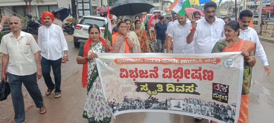 ಉಡುಪಿ: ’79ನೇ ಸ್ವಾತಂತ್ರೋತ್ಸವ’ದ ‘ಹರ್ ಘರ್ ತಿರಂಗಾ’ ಅಭಿಯಾನದ ಸಂದರ್ಭದಲ್ಲಿ ದೇಶ ವಿಭಜನೆಯ ಕರಾಳ ಇತಿಹಾಸವನ್ನು ನೆನಪಿಸುವ ‘ವಿಭಜನ ವಿಭೀಷಣ್ ಸ್ಮೃತಿ ದಿವಸ್’ ಪ್ರಯುಕ್ತ ಜಿಲ್ಲಾ ಬಿಜೆಪಿ ವತಿಯಿಂದ ಜಿಲ್ಲಾ ಪ್ರಕೋಷ್ಠಗಳ ಸಹಯೋಗದಲ್ಲಿ ಕಡಿಯಾಳಿಯ ಹೋಟೆಲ್ ಓಷಿಯನ್ ಪರ್ಲ್ ಬಳಿಯಿಂದ ಜಿಲ್ಲಾ ಬಿಜೆಪಿ ಕಛೇರಿಯ ವರೆಗೆ ಬಿಜೆಪಿ ಜಿಲ್ಲಾಧ್ಯಕ್ಷ ಕುತ್ಯಾರು ನವೀನ್ ಶೆಟ್ಟಿ ಅವರ ನೇತೃತ್ವದಲ್ಲಿ ‘ಮೌನ ಮೆರವಣಿಗೆ’ ನಡೆಯಿತು.