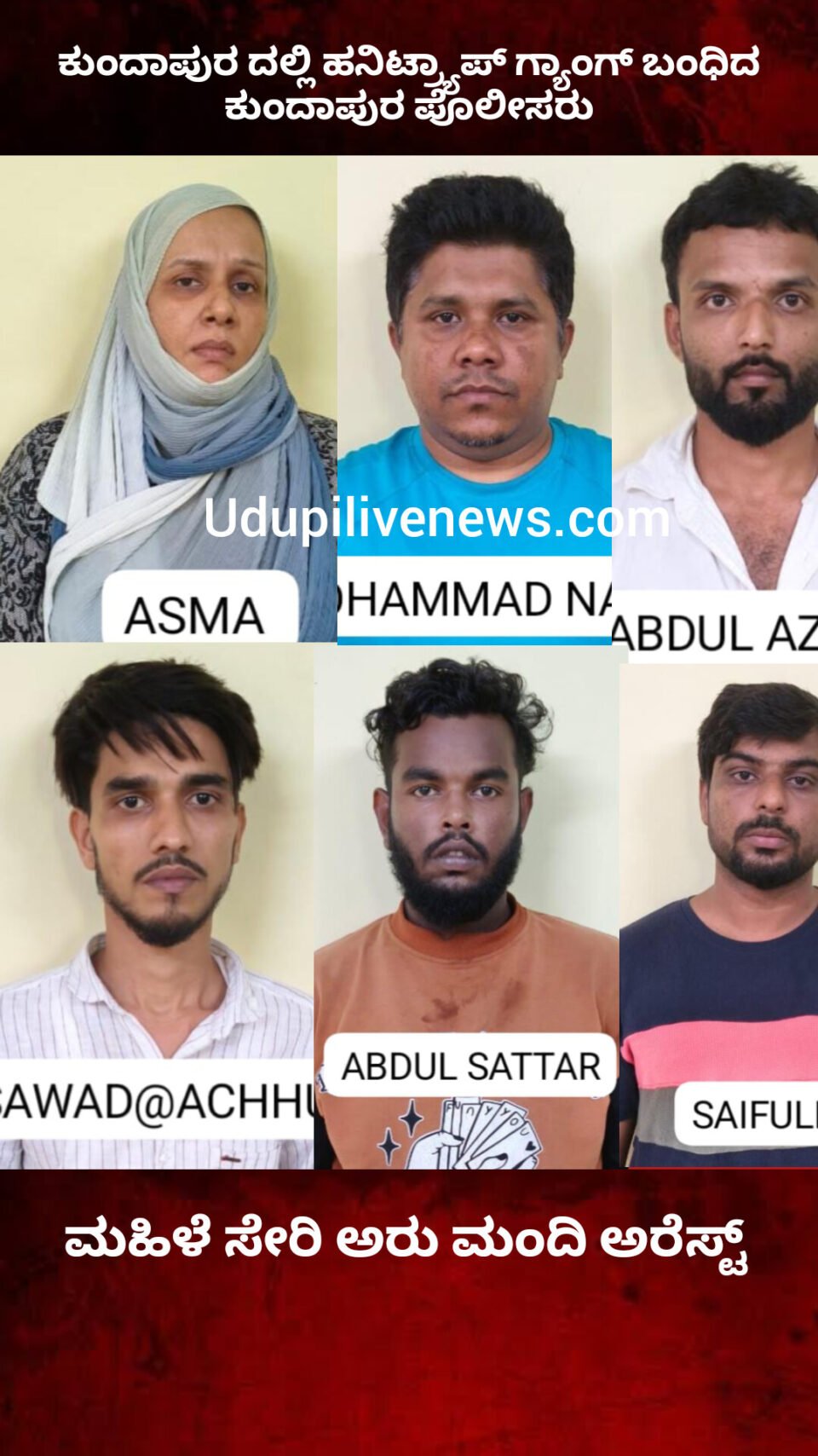ಕುಂದಾಪುರ: ಹನಿಟ್ರ್ಯಾಪ್ ಜಾಲವೊಂದನ್ನು ಬೇಧಿಸಿದ ಕುಂದಾಪುರ ಪೊಲೀಸರು ಮಹಿಳೆ ಸಹಿತ ಒಟ್ಟು 6 ಮಂದಿ ಆರೋಪಿಗಳನ್ನು ಬಂಧಿಸಿದ್ದಾರೆ.