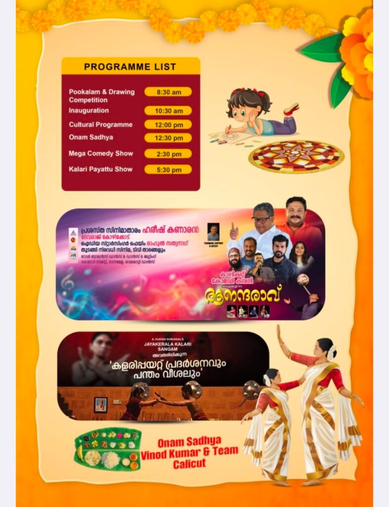 ಇನ್ನೂ ಓಣಂ ಸಂಭ್ರಮಾಚರಣೆಯ ಉದ್ಘಾಟನೆ ಬೆಳಿಗ್ಗೆ 10.30ಕ್ಕೆ ಸರಿಯಾಗಿ ನಡೆಯಲಿದೆ .ಇದಕ್ಕೂ ಮೊದಲು ಅಂದರೆ 8.30ಕ್ಕೆ ಸರಿಯಾಗಿ “ಪೂಕಳಂ ಸ್ಪರ್ಧೆ” ನಡೆಯಲಿದೆ. ಆ ಬಳಿಕ ಕೇರಳ ಸಮಾಜಂ ಸದಸ್ಯರಿಂದ ಸಾಂಸ್ಕೃತಿಕ ಕಾರ್ಯಕ್ರಮ ನಡೆಯಲಿದೆ. ಮಧ್ಯಾಹ್ನ ಓಣಂ ಹಬ್ಬದ ಪ್ರಮುಖ ಭಾಗವಾಗಿರುವ ‘ಒಣಂ ಸಧ್ಯ’ ಅಂದರೆ ಓಣಂ ವಿಶೇಷ ಭೋಜನವನ್ನು ಕೇರಳದ ಕ್ಯಾಲಿಕಟ್ ನ ವಿನೋದ್ ಕುಮಾರ್ ತಂಡದವರಿಂದ ಏರ್ಪಡಿಸಲಾಗಿದೆ. ಭೋಜನದ ಬಳಿಕ ಕೇರಳದ ಸಿನಿಮಾ ಕಲಾವಿದರ ತಂಡದಿಂದ ವೈವಿಧ್ಯಮಯ ಸಂಗೀತ, ನೃತ್ಯ, ಮಿಮಿಕ್ರಿ, ಹಾಸ್ಯಭರಿತ ಮನೋರಂಜನಾ ಕಾರ್ಯಕ್ರಮಗಳು ನಡೆಯಲಿವೆ.